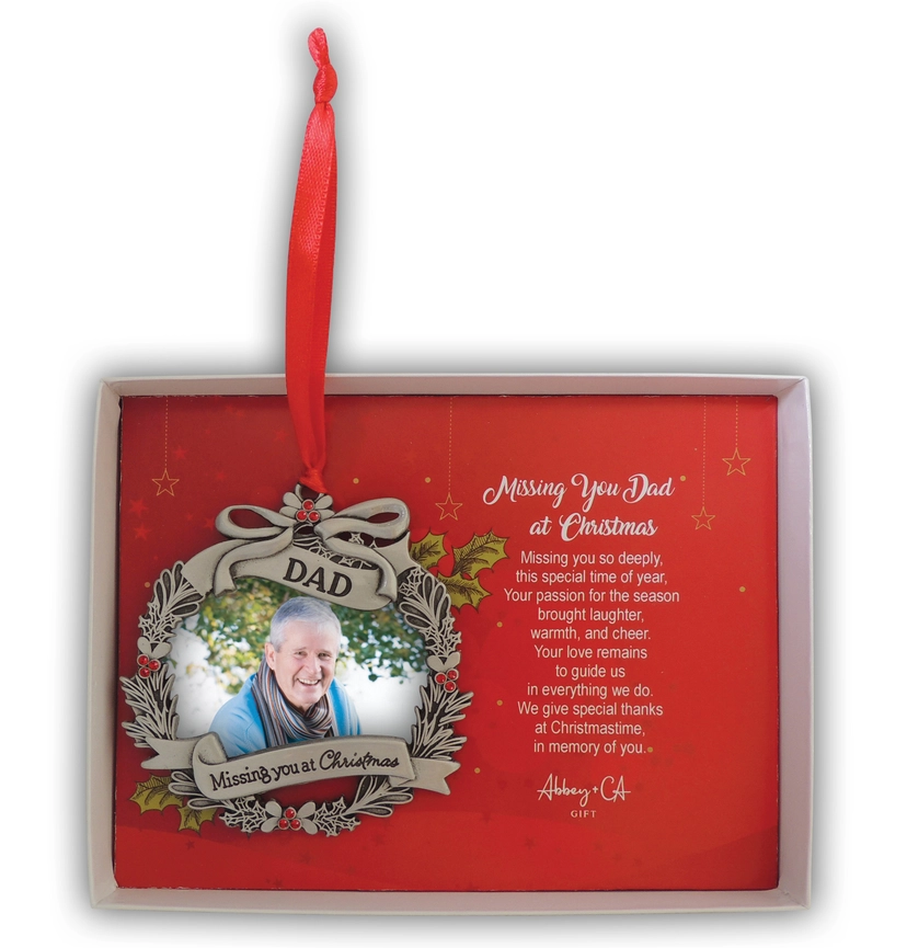Cast metal wreath frame with red stones. Hangs from red ribbon. Window boxed.