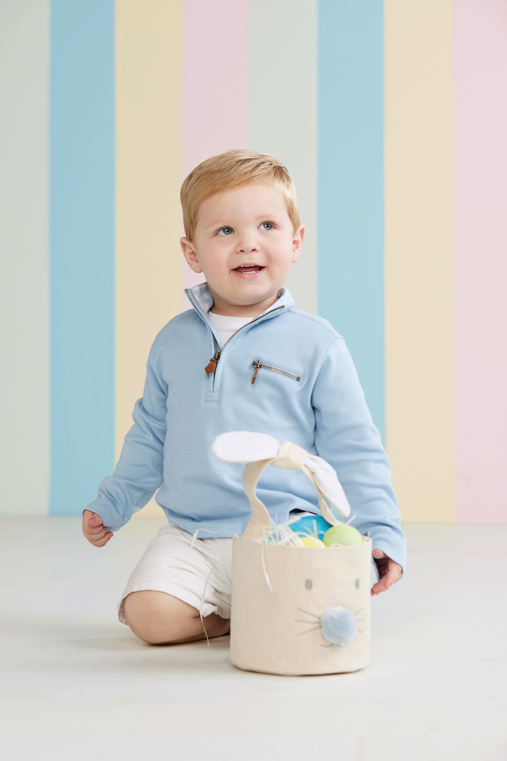 Cotton interlock pullover with quarter zip neckline with gingham lining features faux zipper chest pocket, gingham elbow patches and side vent hem.