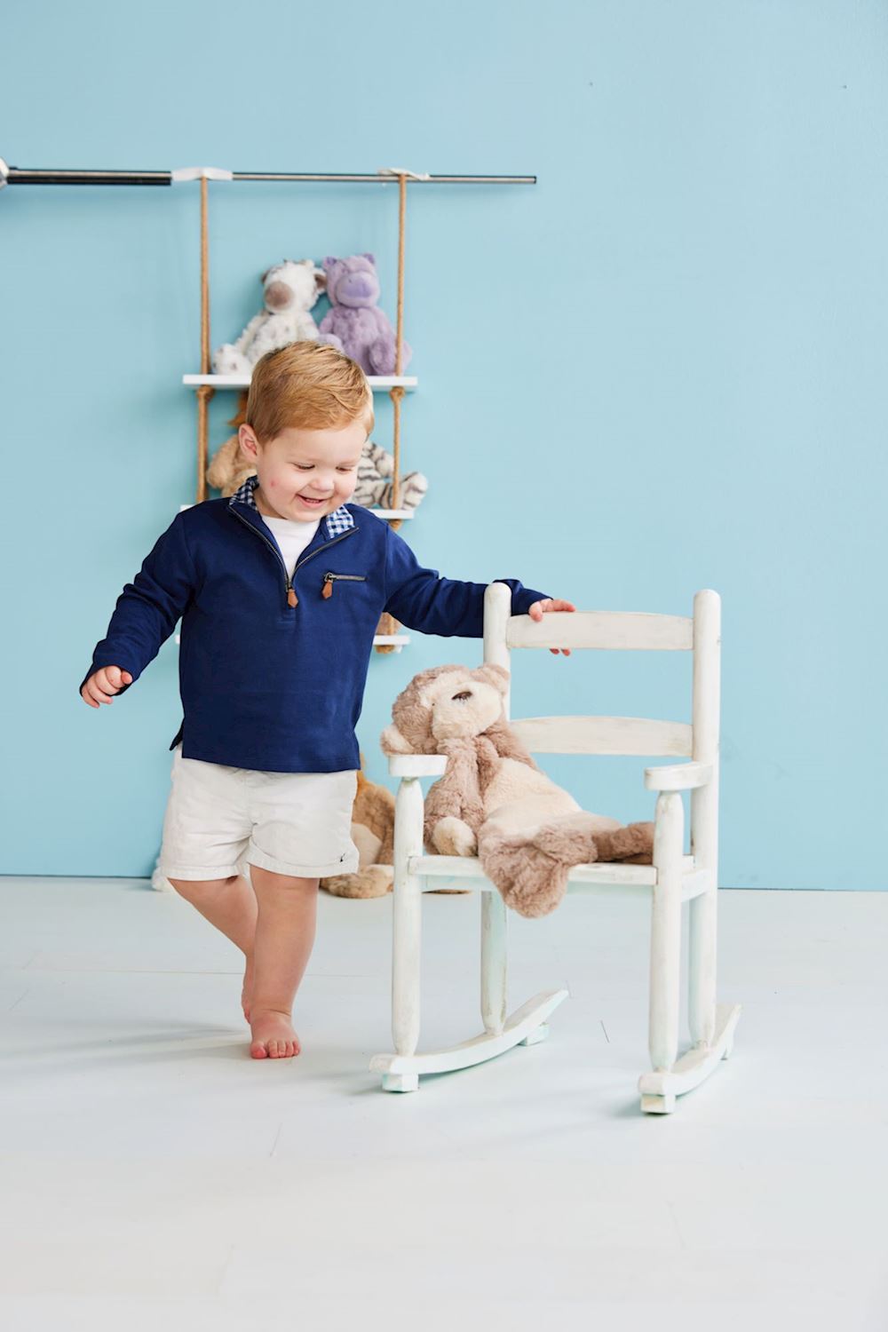 Cotton interlock pullover with quarter zip neckline with gingham lining features faux zipper chest pocket, gingham elbow patches and side vent hem.
