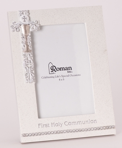 This beautiful 8″ frame has a silver scroll and chalice design. It will hold a 4×6 vertical photo.